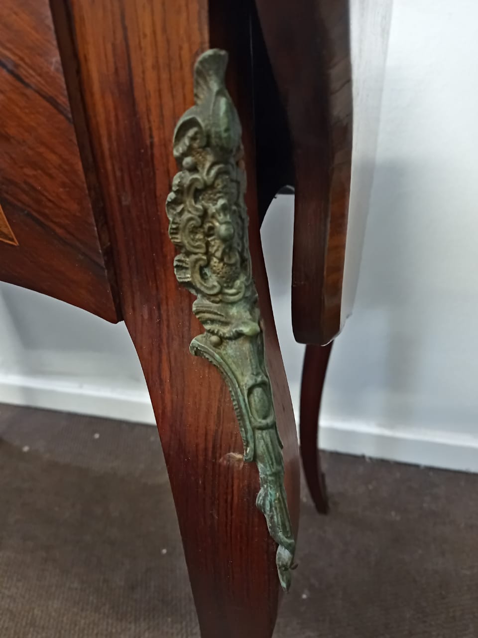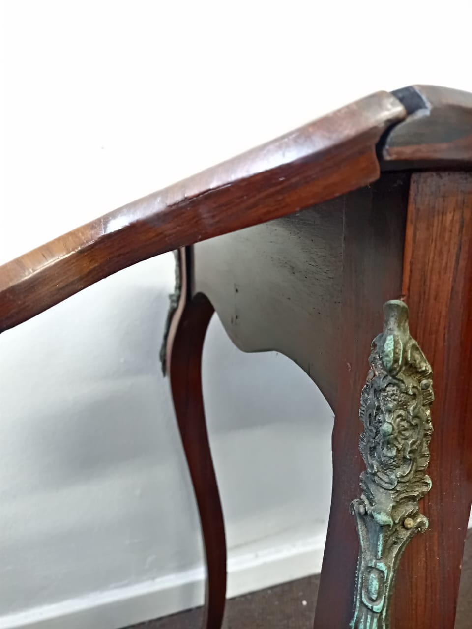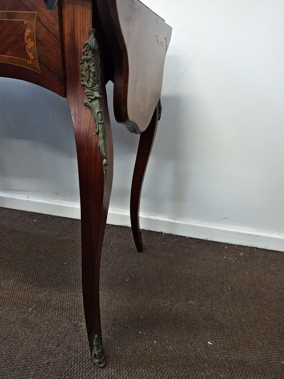 The Vintage Floral Marquetry Drop Leaf Table is a charming, traditional piece with intricate floral inlay detailing. Measuring 76 cm in height, it has a compact size with the flaps down, offering a length of 75 cm and a width of 58 cm. When the side flaps are open, the table extends to 121 cm in length, making it suitable for additional surface space. The table is in good condition overall, with the only missing feature being the supports to keep the side flaps upright, which could be replaced or repaired for full functionality. With some minor wear due to age and usage.