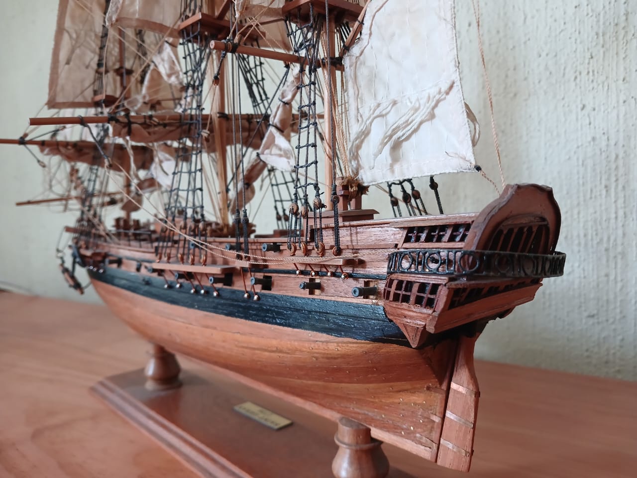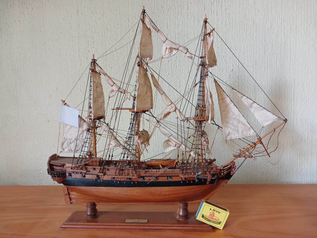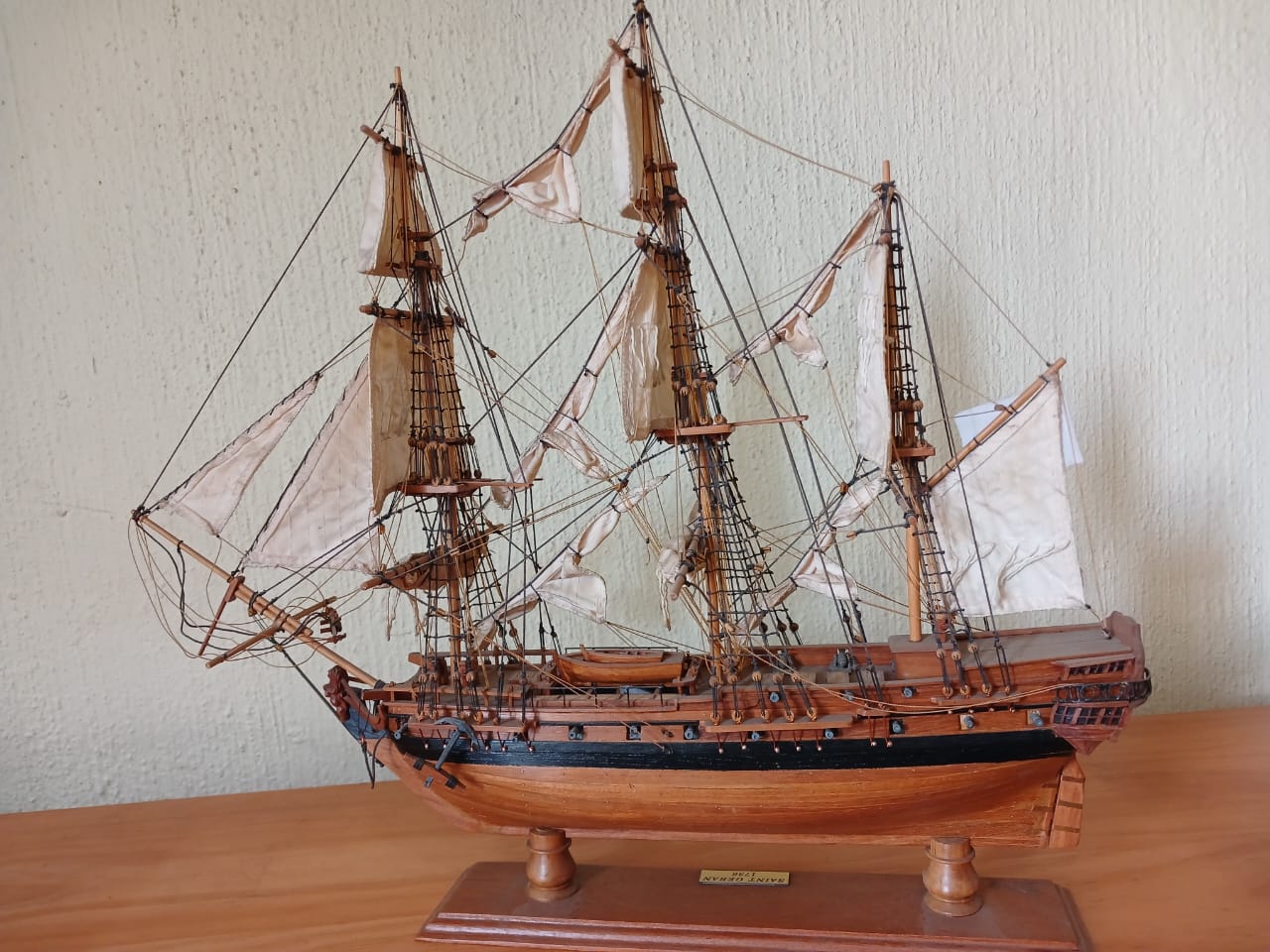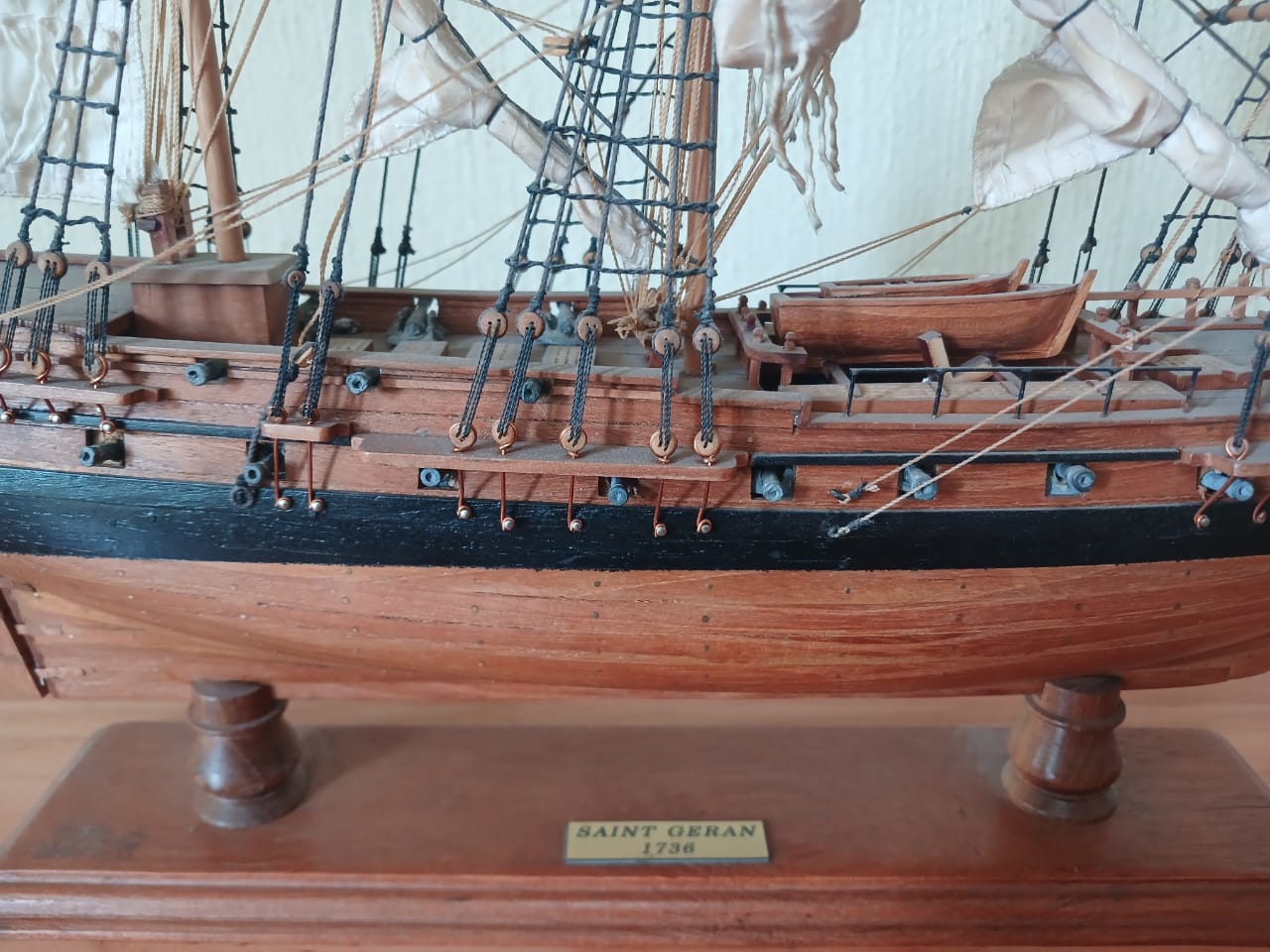 This Saint Geran model is a scale replica of the historical French merchant ship, the Saint Géran, which was launched in 1736. This models is highly detailed, featuring realistic construction with wood, cotton, and metal. A desirable model popular as decorative piece or collector’s item.