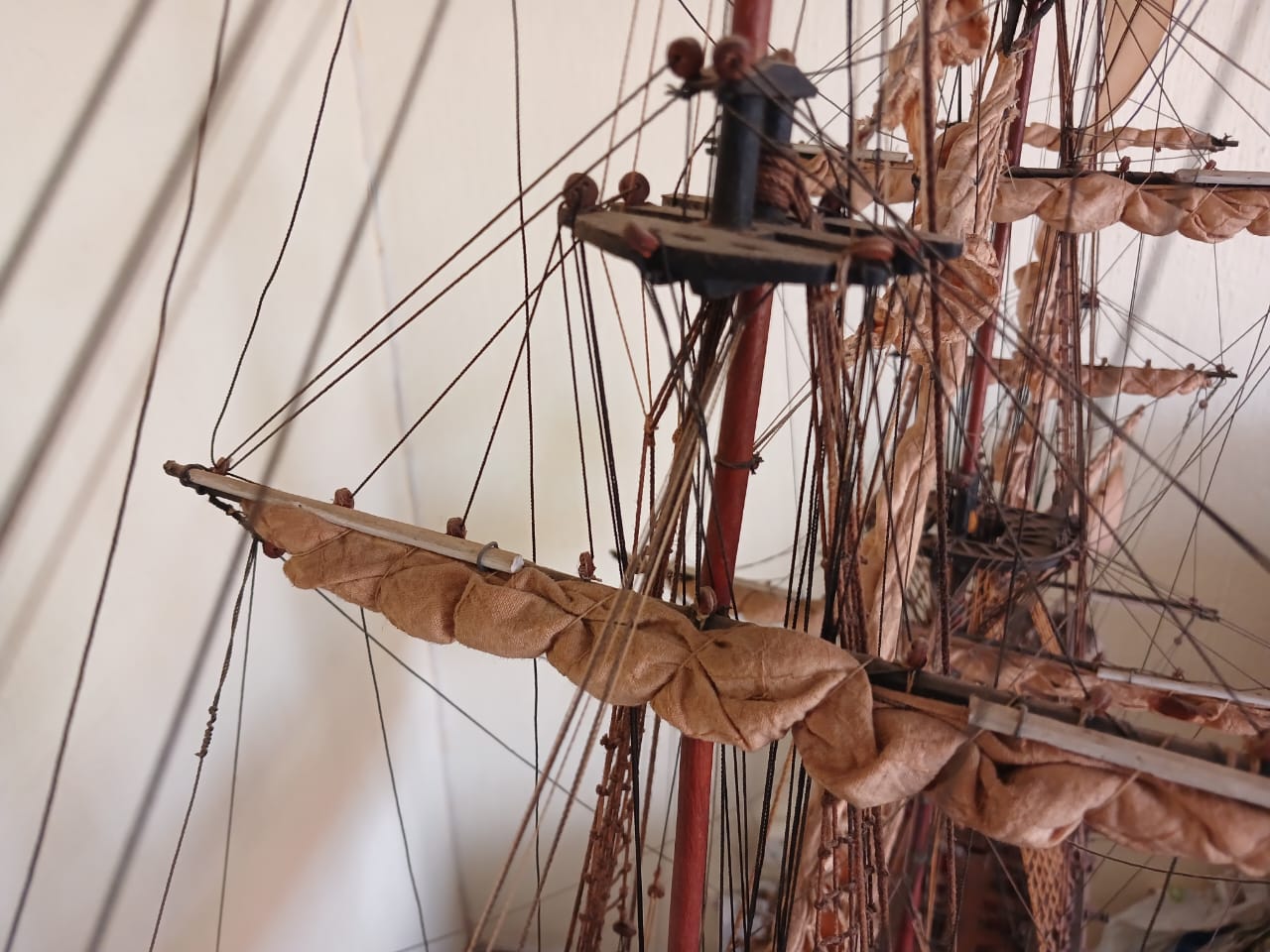 A finely handcrafted wooden model of the Bounty ship, beautifully detailed with cotton sails and metal fittings. This vintage replica captures the timeless design of the famous HMS Bounty, known for its historic voyage and enduring legacy.