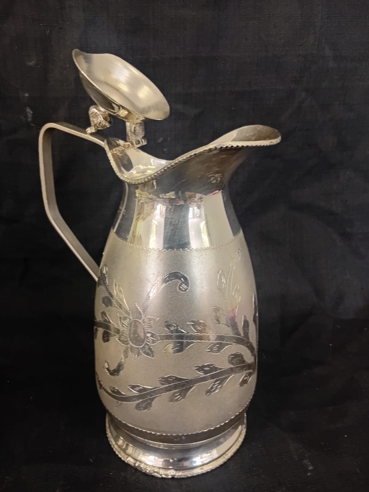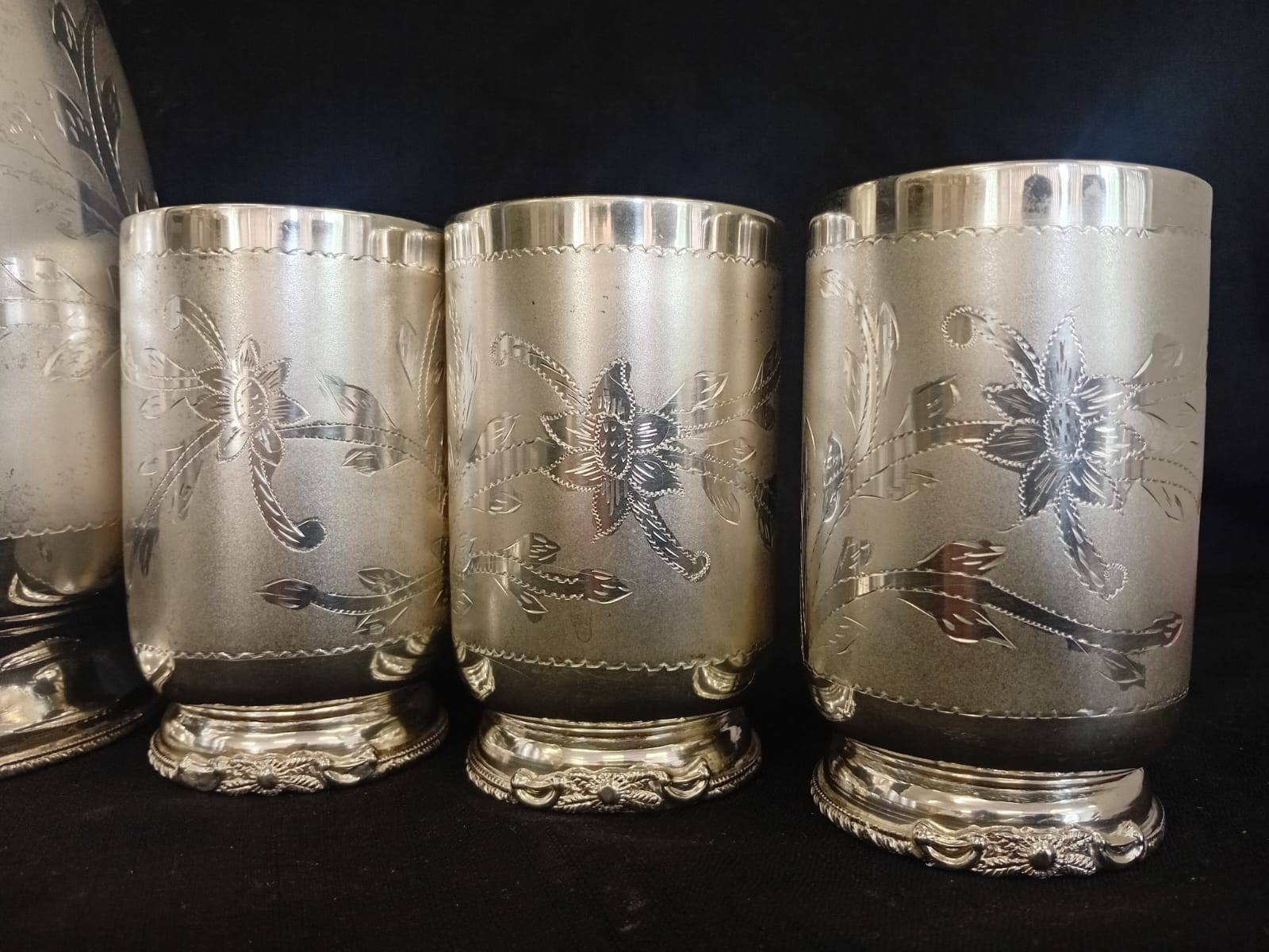 An elegant vintage set comprising of a wine or water pitcher accompanied by six matching cups. Each piece features delicate floral engravings and ornate bases, showcasing fine craftsmanship. The underside of each item is stamped "Silver". The set presents beautifully and would make a charming addition to any vintage tableware or silver collection.