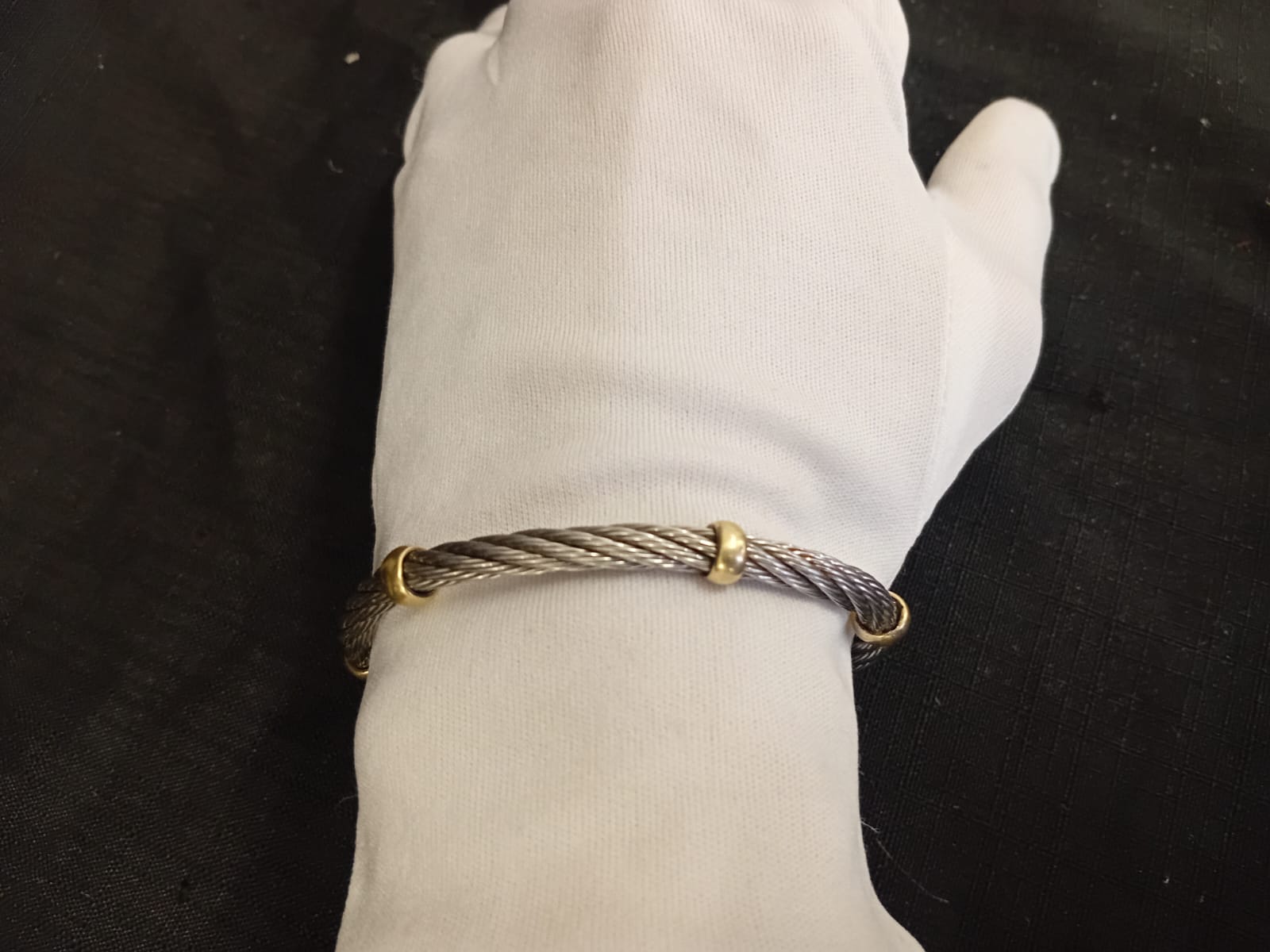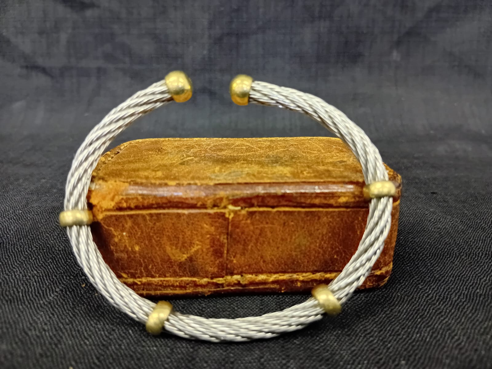 A unisex stylish 9ct gold and cable bracelet, a sleek modern adornment with six evenly spaced 9ct gold bands. Two of the gold bands cleverly conceal the ends of the cable at it’s opening, blending functionality with elegant design. A modern yet timeless piece that pairs strength with sophistication.