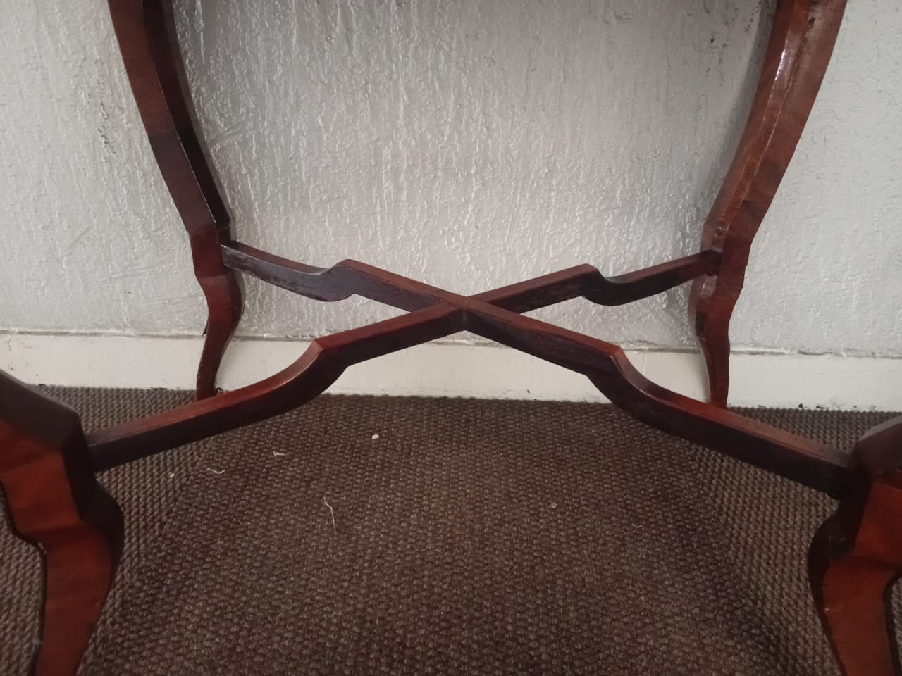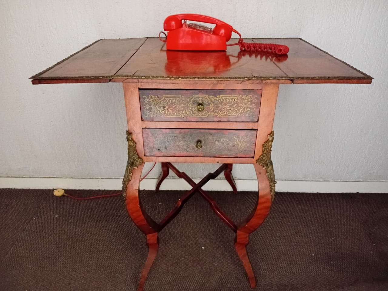 This side table features ornate brass embellishments. It has a drop-leaf design, allowing the sides to extend for additional surface space. One side of the table has two drawers adorned with decorative inlays and metal handles, while the opposite side contains a fold-open compartment to store larger objects or be used for additional functionality. The curved legs and intricate patterns contribute to its elegant and antique aesthetic.