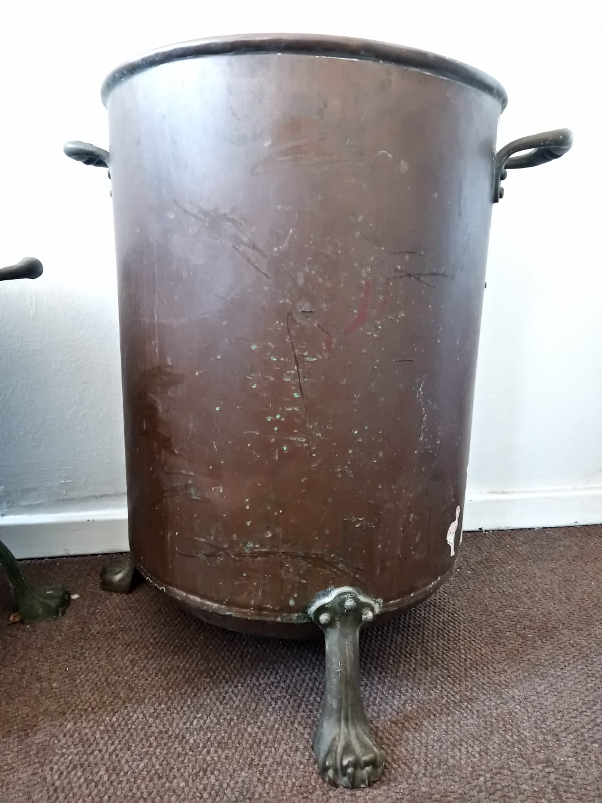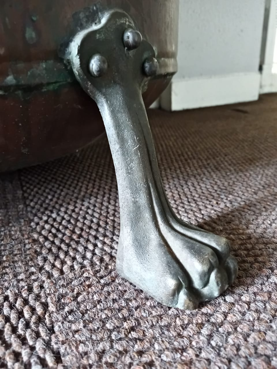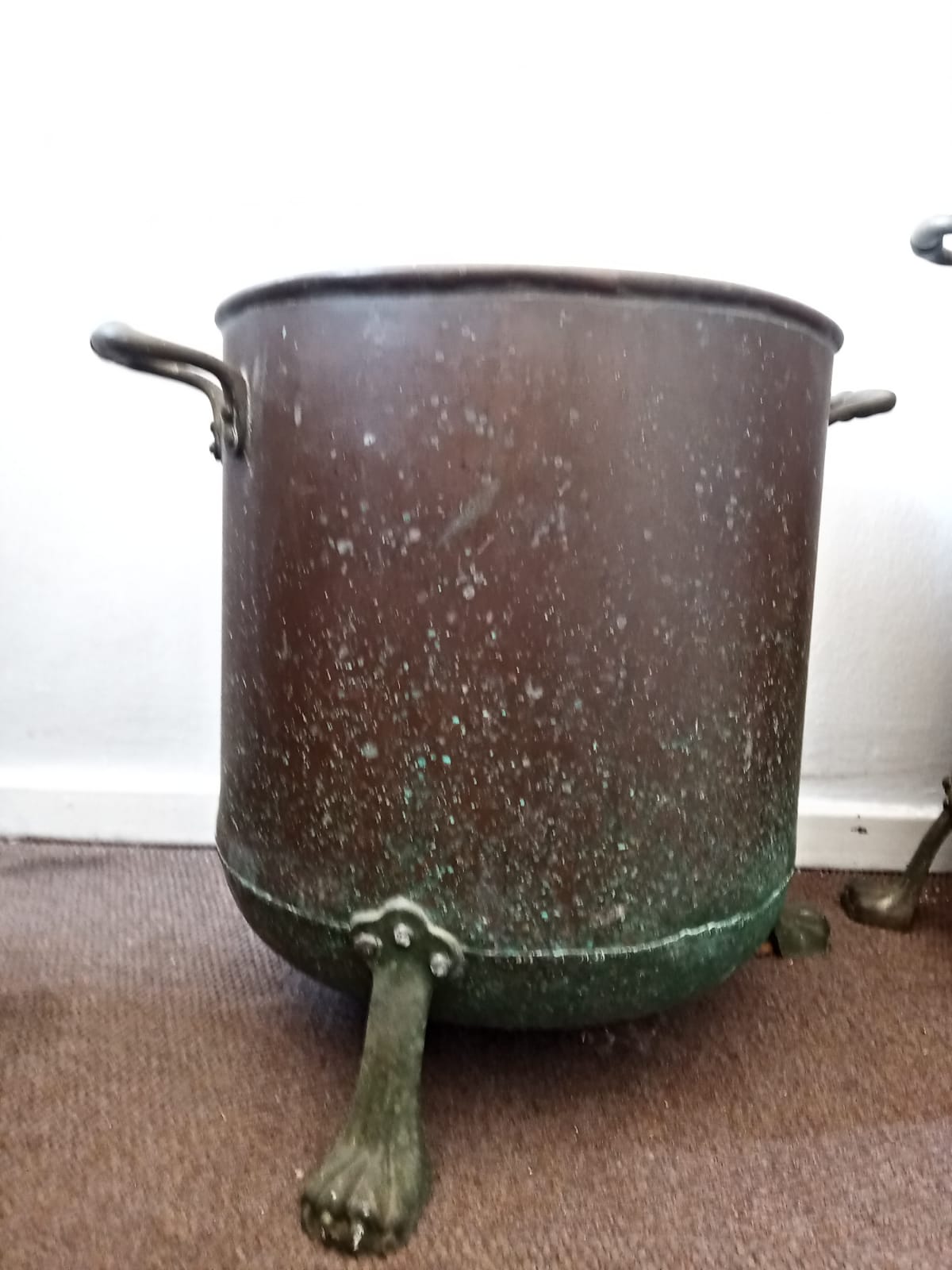 These striking planter pots are distinctive and interesting décor pieces. Each planter features three lions feet cast of brass, giving them a regal and sturdy appearance. The planters are different in height: one measures 50 cm in height and the other 66 cm in height, but both share the same dimensions of 60 cm from handle to handle and a 45 cm diameter.