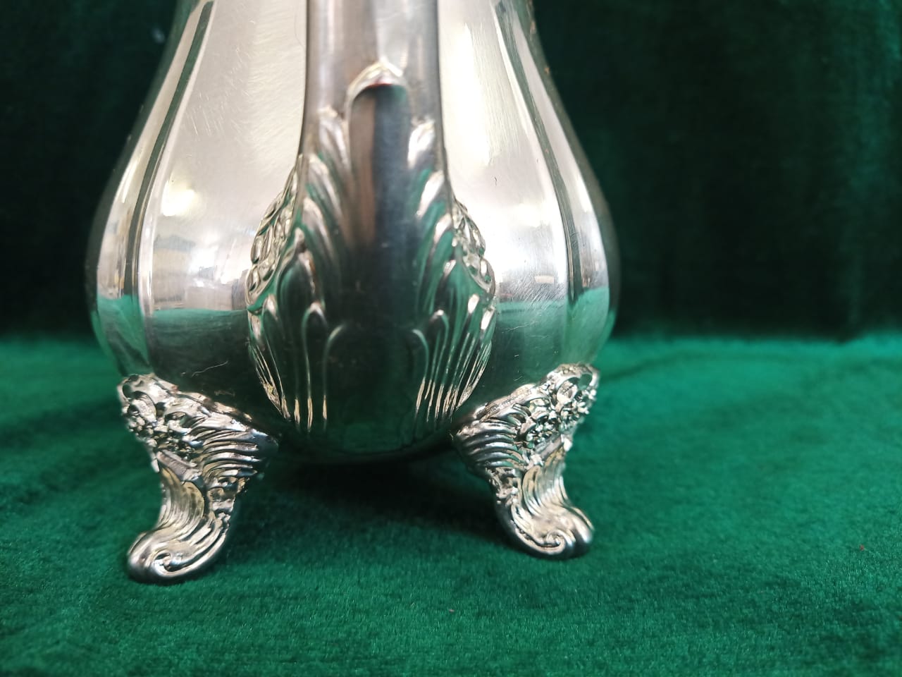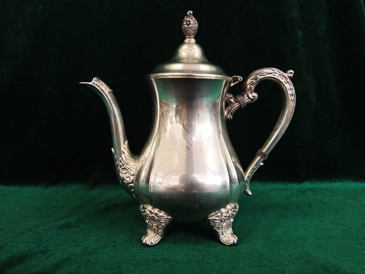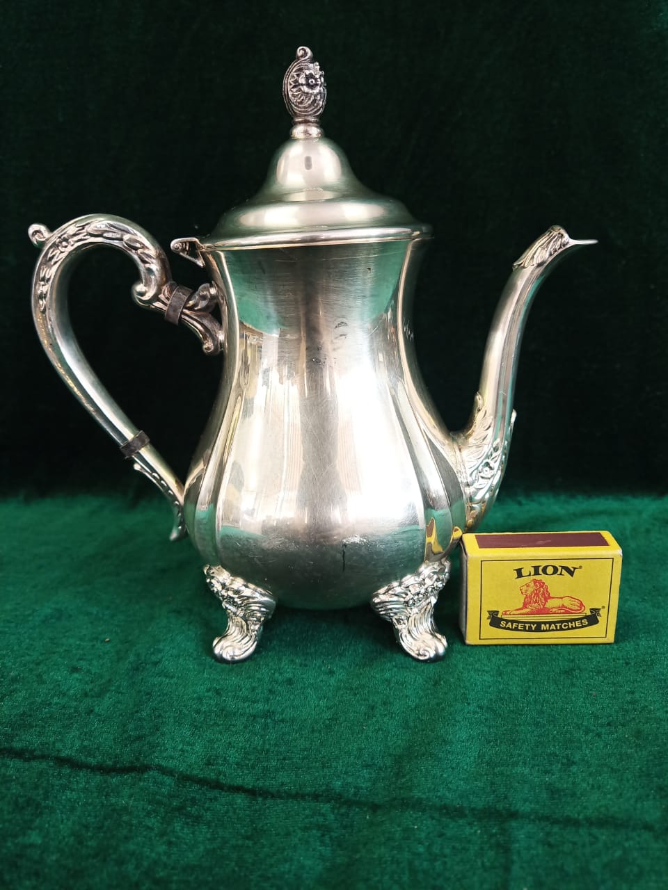 This elegant silver-plated coffee/tea pot stands 21 cm tall and measures 21 cm from spout to handle. Its classic design features a polished finish that beautifully reflects light, adding a touch of sophistication to any table setting. The pot is adorned with intricate detailing, including a decorative handle and spout, combining functionality with vintage charm. Ideal for serving beverages at gatherings or as a decorative piece, this pot captures the timeless elegance of traditional serve ware.