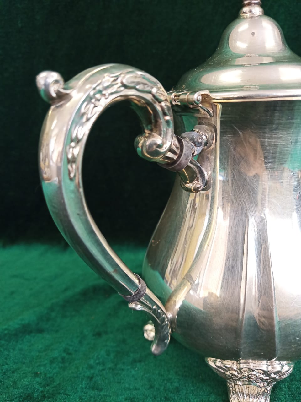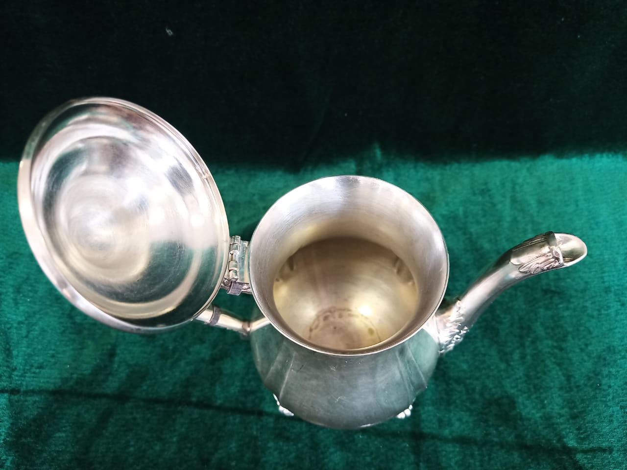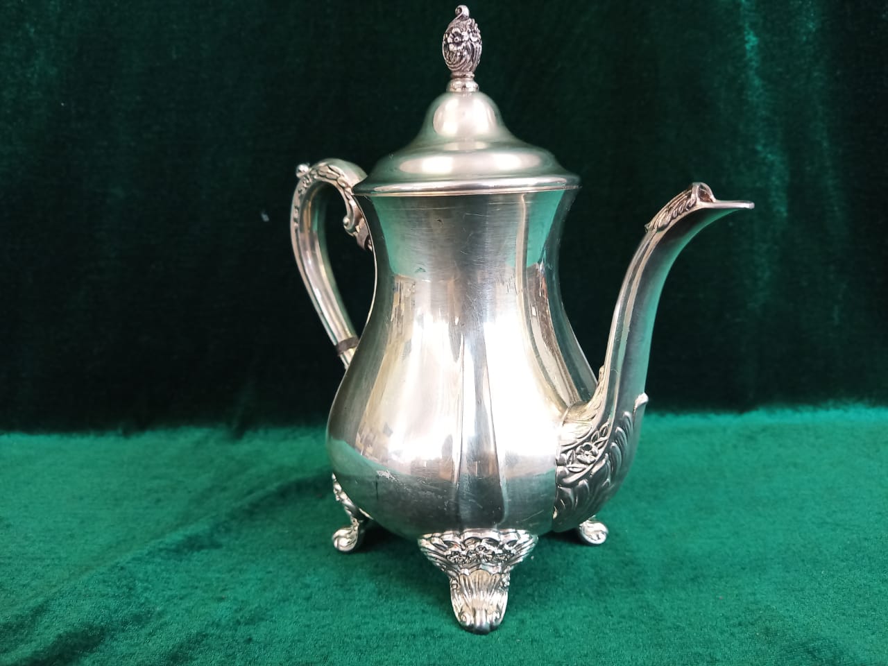 This elegant silver-plated coffee/tea pot stands 21 cm tall and measures 21 cm from spout to handle. Its classic design features a polished finish that beautifully reflects light, adding a touch of sophistication to any table setting. The pot is adorned with intricate detailing, including a decorative handle and spout, combining functionality with vintage charm. Ideal for serving beverages at gatherings or as a decorative piece, this pot captures the timeless elegance of traditional serve ware.