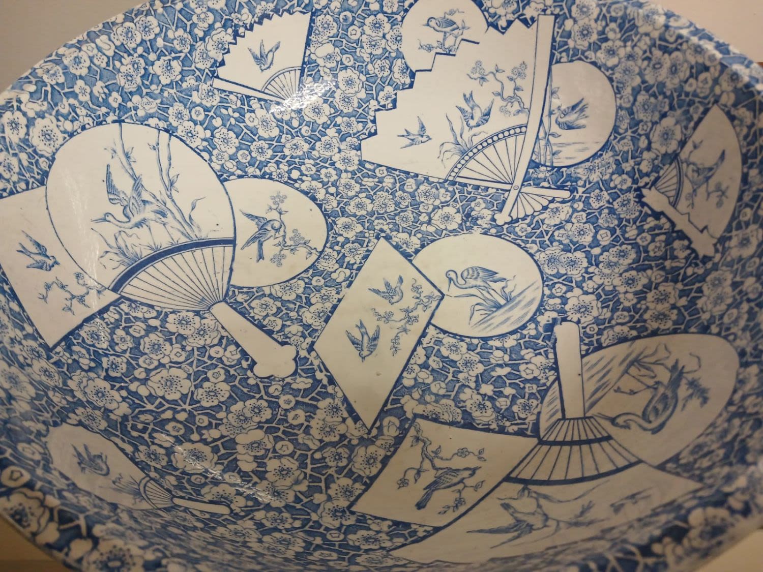 This exquisite set showcases captivating blue and white hues depicting typical Japanese iconographic imagery such as fans, swallows and cranes . Crafted with meticulous attention to detail, the pitcher and basin elegantly complement each other, creating a stunning visual appeal. The set is in good condition, with anticipated crazing that adds to its vintage charm. Perfect for adding a touch of sophistication to any table, this bowl and pitcher set is a timeless addition to your collection.