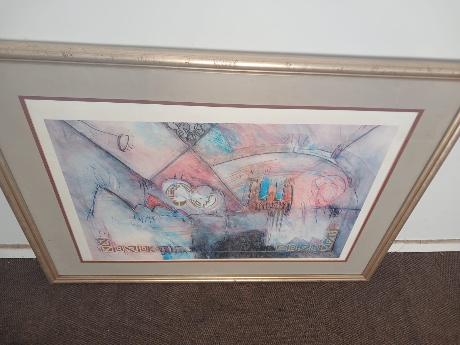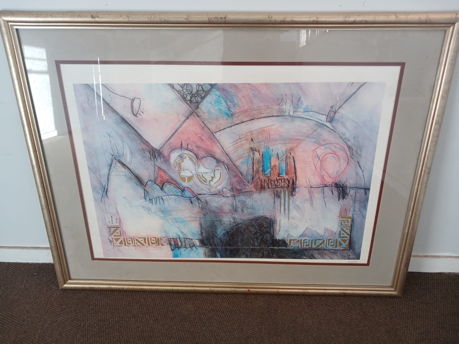 This signed Abstract Jay Hill work is in good condition it has slipped in the frame but it is not broken or discolored.